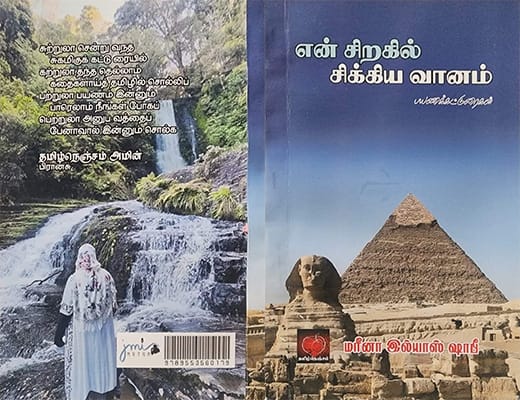 என் சிறகில் சிக்கிய வானம், என் மேல் விழுந்த மழைத் துளிகள் என்ற பயண கட்டுரைகள் “என்” என்ற சொல்லின் மூலம் பயண கட்டுரையை தனித்துவமான புத்தகமாக வெளியிட்டுக் கொண்டிருக்கும் சகோதரி மரீனா இல்யாஸ் ஷாபி  அவர்கள் Sri Lanka pen club உறுப்பினர் என்ற வகையில் சென்ற மாநாட்டில் அவரது “என் சிறகில் சிக்கிய வானம்’ என்ற புத்தகம் என் கையில் கிடைத்தது.
